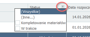 Tabelkę z listą prac i listą dokumentów można sortować klikając na nagłówek kolumny. W nagłówkach dostępne są również opcje filtrowania: