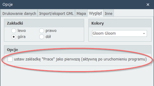 Domyślnie zakładka "Prace" wyświetlana jest jako ostatnia. W opcjach programu można to zmienić włączając opcję: