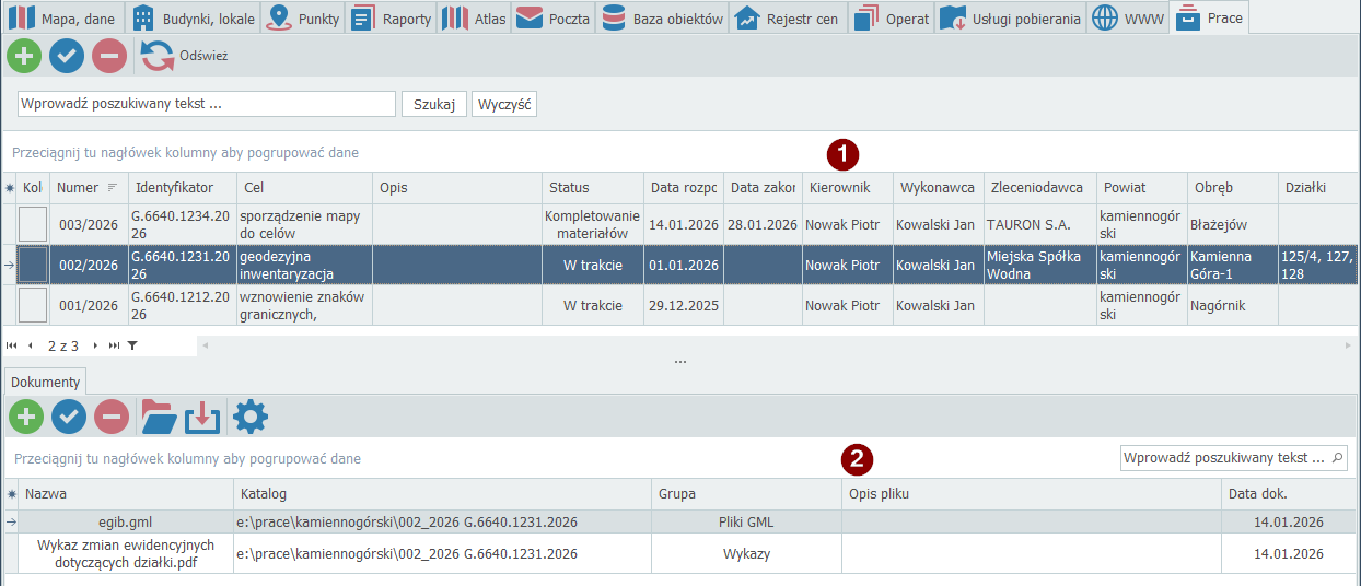 Zakładka "Prace" pozwala prowadzić rejestr prac geodezyjnych. Dane przechowywane są na serwerze i dostępne dla wszystkich użytkowników w firmie (dla konta głównego i kont dodatkowych).