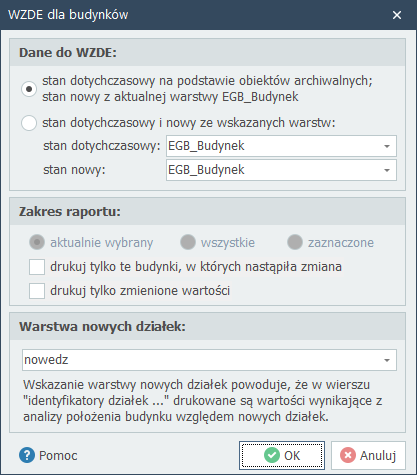 4. Po wprowadzeniu zmian przechodzimy do wykonania raportu WZDE w oknie "Budynki i lokale" wybierając szablon z grupy "WZDE stan dotychczasowy i nowy z różnych warstw". W okienku jakie się otworzy wskazujemy odpowiednie warstwy dla stanu nowego i dotychczasowego. Jako zakres raportu możemy wybrać "wszystkie" i dodatkowo włączyć opcję "drukuj tylko te budynki, w których nastąpiła zmiana". W takim przypadku program sam wyszuka budynki których dane uległy zmianie.